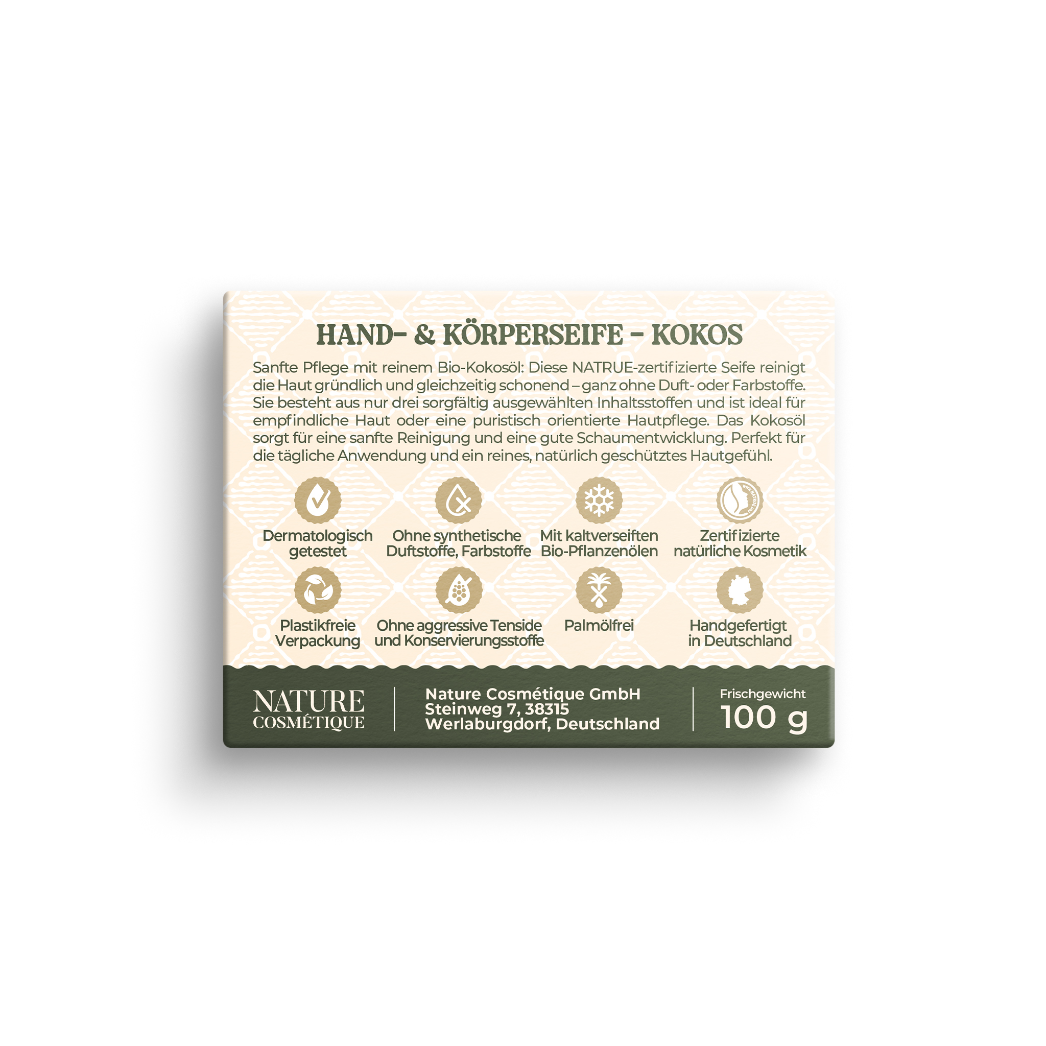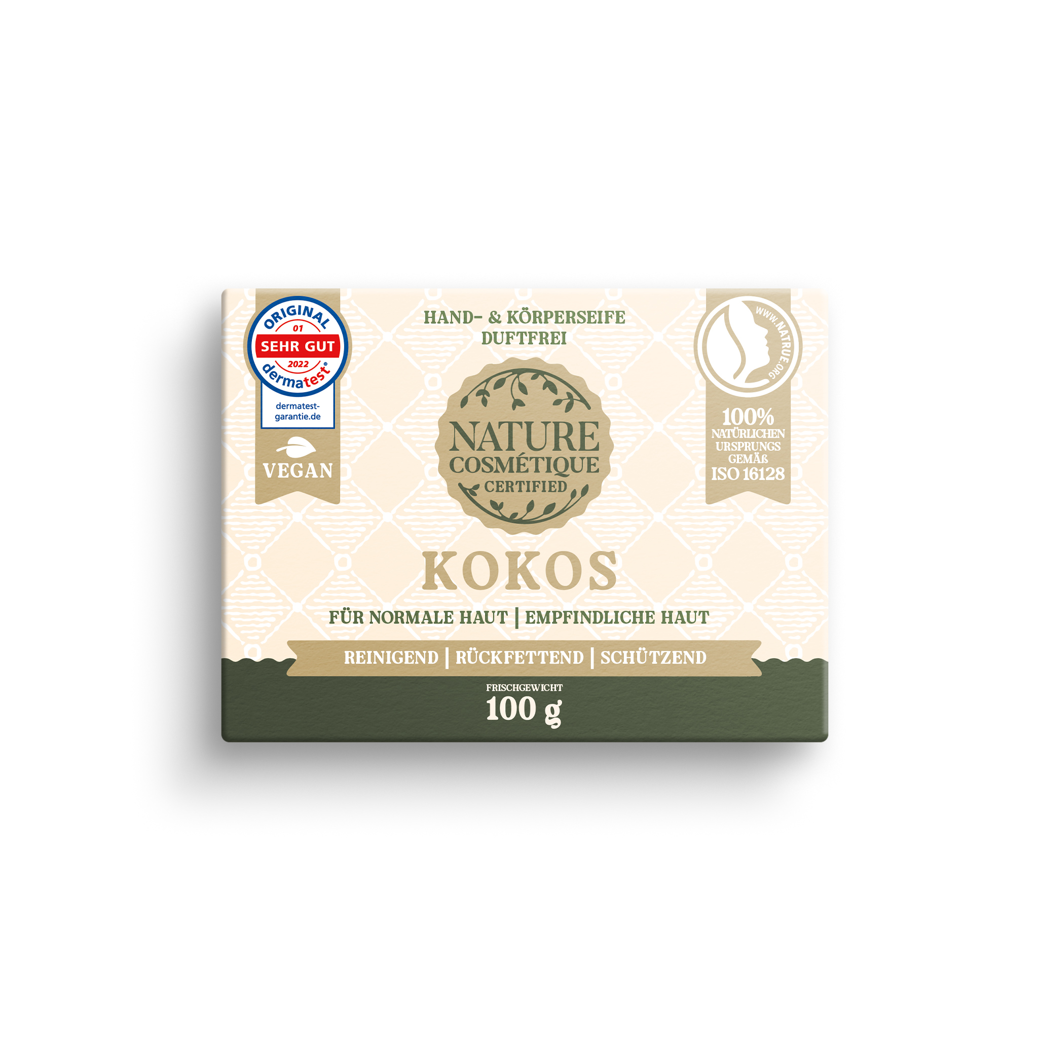 Die Hand- & Körperseife KOKOS von Nature Cosmétique aus der Linie CERTIFIED ist eine puristische, sanft pflegende feste Naturseife für die tägliche Reinigung von Händen und Körper. Ihre Formel basiert auf nur drei sorgfältig ausgewählten Inhaltsstoffen – darunter 100 % Bio-Kokosöl, das rückfettend wirkt, Feuchtigkeit spendet und die Hautbarriere schützt. Diese kaltverseifte Körper- und Handseife ist ideal für Menschen mit normaler Haut, die eine milde, zuverlässige Reinigung ohne überflüssige Zusätze suchen. Gleichzeitig eignet sie sich auch hervorragend für empfindliche Hauttypen, da sie komplett auf Duftstoffe, Farbstoffe, ätherische Öle sowie synthetische Zusatzstoffe verzichtet. Der cremige, ergiebige Schaum reinigt gründlich, ohne die Haut auszutrocknen. Die minimalistische Rezeptur ist NATRUE-zertifiziert, besteht zu 96 % aus Inhaltsstoffen natürlichen Ursprungs gemäß ISO 16128 und wurde dermatologisch mit SEHR GUT bewertet. Sie ist plastikfrei verpackt, vegan und wird in Deutschland handgefertigt.
