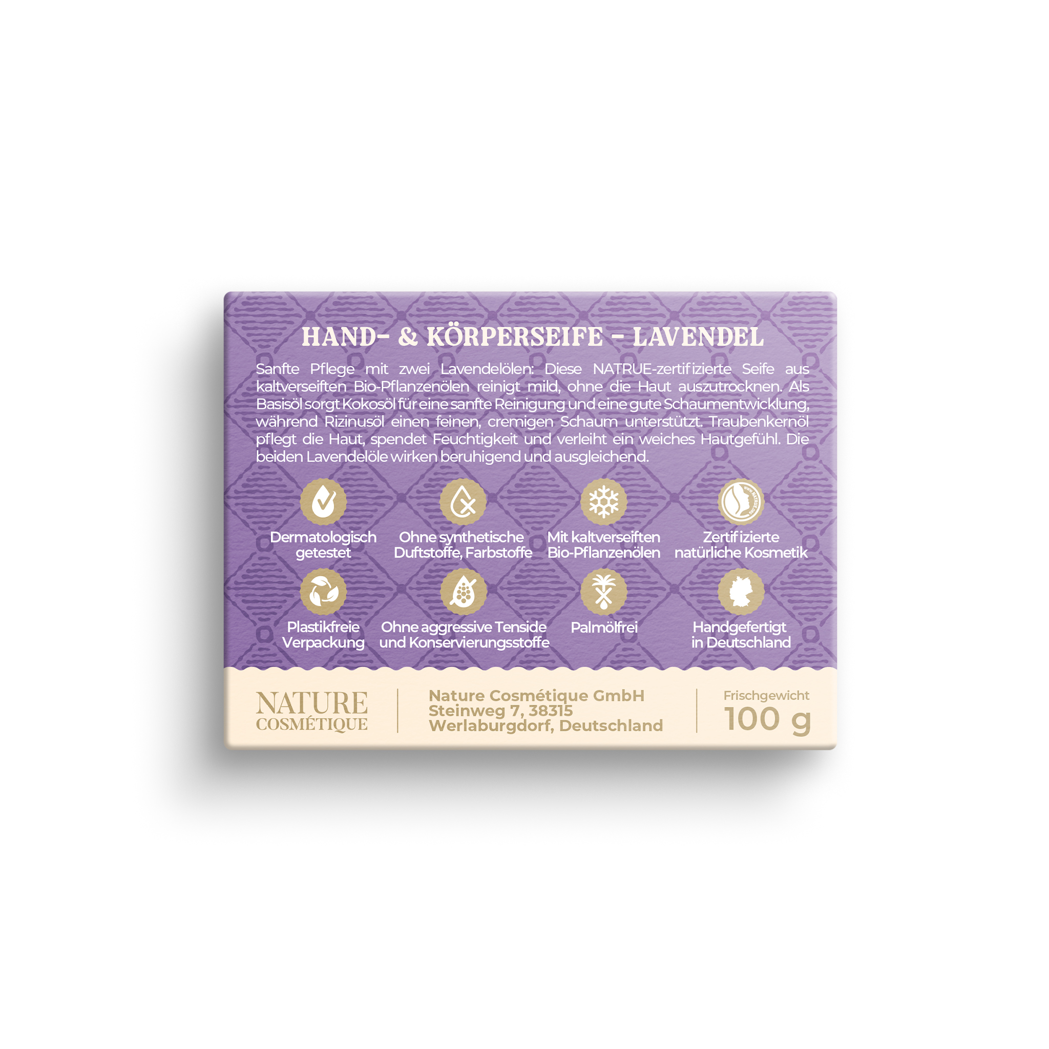 Die Hand- & Körperseife LAVENDEL von Nature Cosmétique aus der Linie CERTIFIED ist eine besonders milde, hautschonende Naturseife für die tägliche Reinigung, ideal für empfindliche oder reife Haut. Sie wird im traditionellen Kaltrührverfahren handgefertigt und enthält hochwertige, kaltverseifte Bio-Pflanzenöle wie Kokosöl, Traubenkernöl und Rizinusöl. Als Basisöl trägt Kokosöl zu einer sanften Reinigung und einer guten Schaumentwicklung bei, während Rizinusöl einen feinen, cremigen Schaum unterstützt. Mit einem Rückfettungsgrad von 8 % hilft die Seife dabei, die Haut während der Reinigung vor dem Austrocknen zu schützen und ein gepflegtes Hautgefühl zu bewahren. Traubenkernöl unterstützt die Hautpflege und trägt dazu bei, die Haut geschmeidig zu halten. Ätherisches Lavendelöl verleiht der Seife ihren blumig-krautigen Duft und trägt zu einem beruhigenden, ausgleichenden Pflegeerlebnis bei. Die ausgewogene Formulierung unterstützt die Hautpflege während der Reinigung und trägt zu einem regenerierten, ausgeglichenen Hautgefühl bei. Die Seife ist NATRUE-zertifiziert, dermatologisch mit SEHR GUT bewertet, besteht zu 100 % aus Inhaltsstoffen natürlichen Ursprungs gemäß ISO 16128, ist frei von synthetischen Duft- und Farbstoffen und wird plastikfrei verpackt – für eine bewusste, vegane Körperpflege mit Verantwortung.