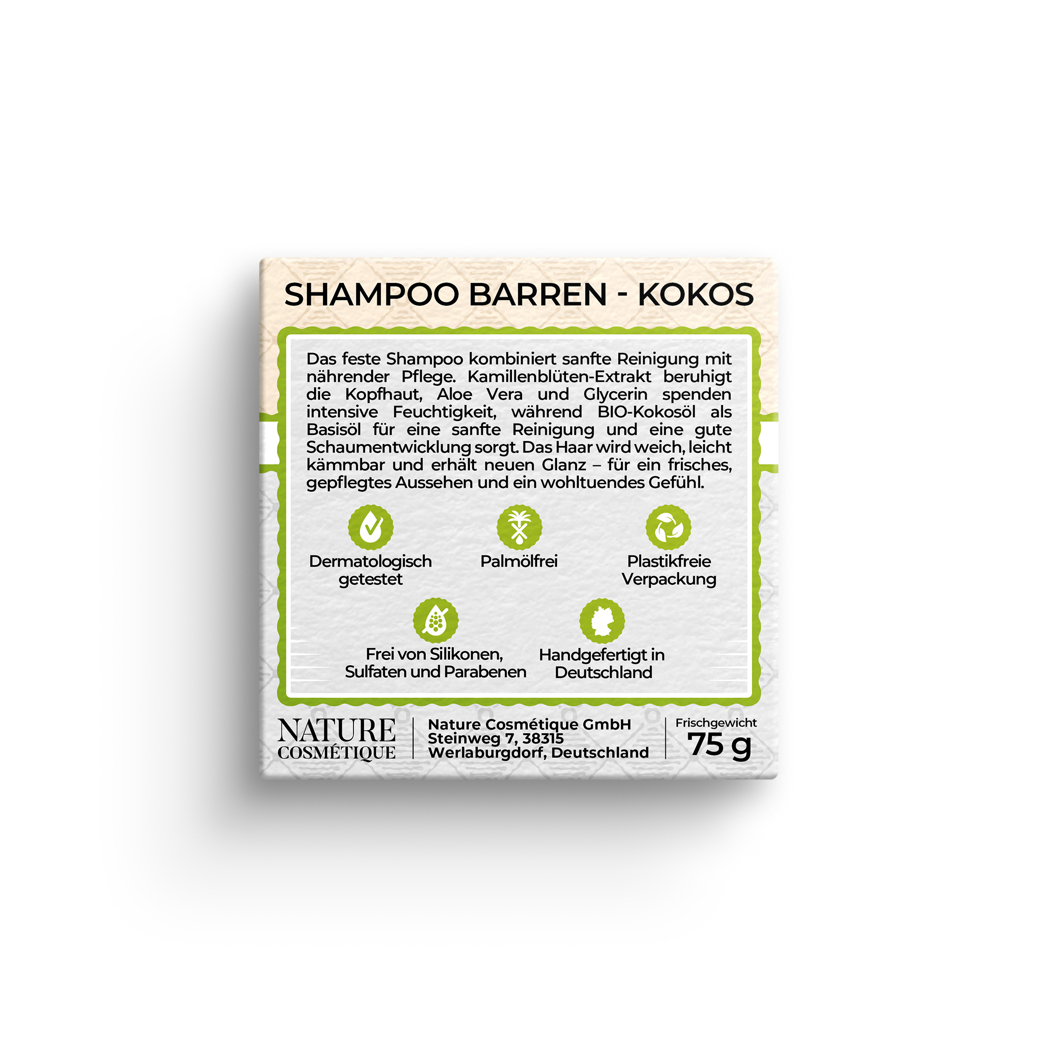 Sanfte Reinigung, spürbare Pflege und ein wohltuendes Gefühl – das feste KOKOS Shampoo mit Kamillenblüten-Extrakt und ALOE Vera von Nature Cosmétique BASIC vereint natürliche Wirkstoffe für gesund aussehendes Haar und eine ausgeglichene Kopfhaut. Die milde Formulierung reinigt gründlich, ohne auszutrocknen oder zu reizen, und sorgt für ein frisches, gepflegtes Haargefühl. Kamillenblüten-Extrakt beruhigt die Kopfhaut und unterstützt ihre natürliche Schutzfunktion. Aloe Vera und Glycerin spenden intensive Feuchtigkeit, während BIO-Kokosöl die Hautbarriere stärkt und so den Feuchtigkeitsverlust reduziert. Das Haar wird geschmeidiger, glänzender und erhält neue Vitalität. Mit Guar erhält das Shampoo einen natürlichen Conditioner-Effekt und verbessert die Kämmbarkeit – für spürbar weiches und gepflegtes Haar. Die ausgewogene Formulierung ist ideal abgestimmt auf die Bedürfnisse von empfindlicher, trockener oder normaler Kopfhaut.